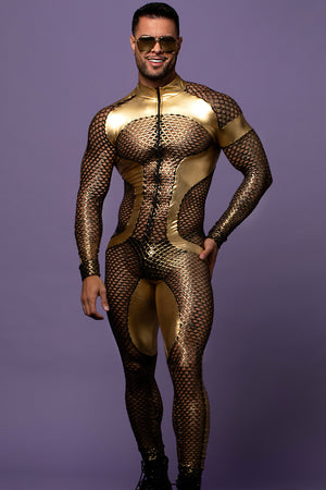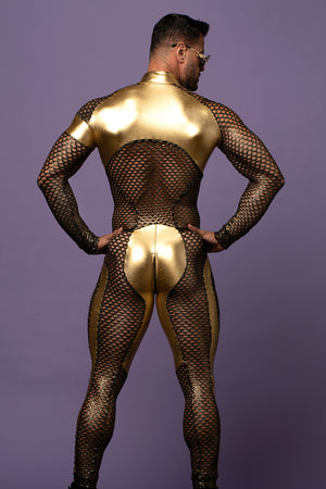 The net material clings to your body perfectly and shimmers as it is treated with a gold metallic finish and the gold spandex has a gold metallic finish as well. You won't find a suit like this anywhere in the world. The suit has a chest and crotch zipper for your convenience.