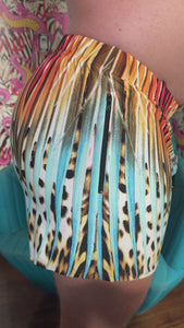 This print is really fantastic. It a great blend of all things "exotic". The mid length cut works on anyone and the stretchy light weight material makes them a pleasure to wear! These are very limited edition and will not be remade or available for very long being the third Summer collection is the final collection of the Summer.