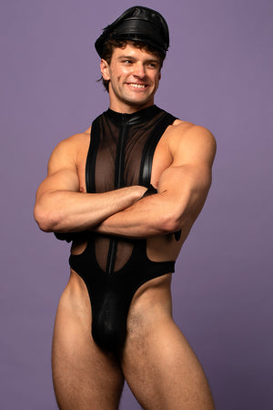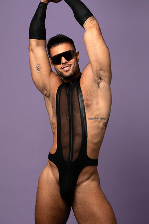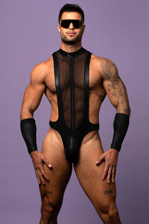 Made of sheer four way stretch mesh and leather look spandex this body suit has almost a priestly look with its higher collar. The thong back however is not exactly holy. We paired the piece with our leather look gauntlets which are also available. They really complete the look.