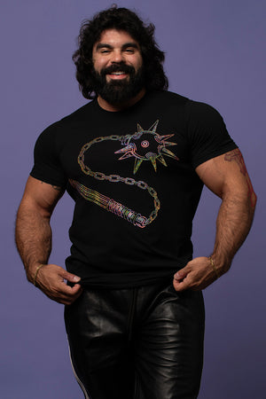 This is my favorite shirt we’ve ever done! Beautiful Aurora Borealis stones set on an ultra premium, super comfy fifty fifty cotton so it has the best stretch and fit! The stones radiate under the light making you look fantastic! Some people call it a mace, some say a war flail, some say a morning star, some even say a holy water sprinkler. Whatever you wanna call it it fulfills your DD dreams! The contrast of a Medieval weapon set in AB stones is FIERCE! This premium cotton tee combines comfort with luxury, making it perfect for both casual wear and special occasions.
