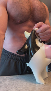 The super cute Silicone Cow Mask offers a RIBBED silicone mouth hole FOR HIS PLEASURE! There are tiny eyeholes for you to see through and the mask is is soft and comfy to wear! The mask pairs perfectly with our Huge Muscle Suit and our Silicone Hooves!